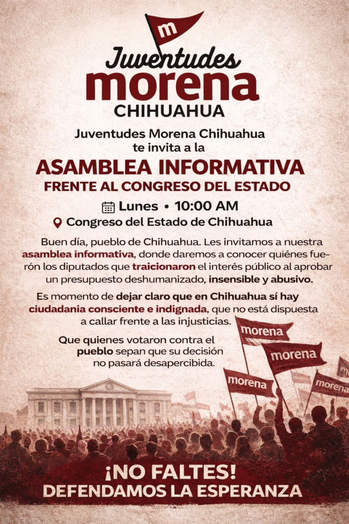 Tres integrantes de las Juventudes de Morena instalaron esta mañana una asamblea informativa frente al Congreso del Estado para denunciar la aprobación del presupuesto para el ejercicio fiscal 2026, al que calificaron como “deshumanizado, insensible y abusivo” hacia la población. Con mantas que exhibían los rostros de los legisladores que votaron a favor del paquete económico, los jóvenes aseguran que la ciudadanía chihuahuense está indignada y que las decisiones políticas que afectan el bolsillo de las familias no deben tomarse a espaldas de la gente.