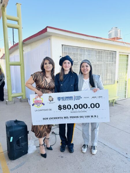 Chihuahua, Chih.- En un emotivo evento realizado en la Escuela Primaria Chihuahua 2000, ubicada en el Distrito 12, la diputada local por el Partido Acción Nacional (PAN), Nancy “La China” Frías, hizo entrega de un cheque significativo destinado a mejoras en el plantel educativo, como parte del reconocimiento al concurso “Diputado y Diputada Infantil 2025”.