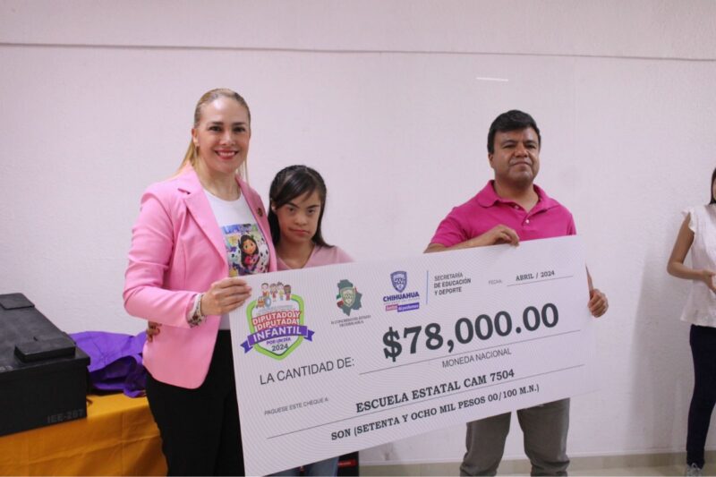 Chihuahua, Chih.- En el marco del Mes de la Niñez, la diputada Diana Pereda del Partido Acción Nacional (PAN), visitó el Centro de Atención Múltiple (CAM) 7504 para apoyar y celebrar la participación de Azul Rodríguez Baquera, estudiante de 12 años que representará a sus compañeros en la próxima edición de Diputado y Diputada Infantil 2024. Azul fue seleccionada entre todos los niños y niñas participantes en la convocatoria, lo que la convierte en una voz destacada para sus compañeros.