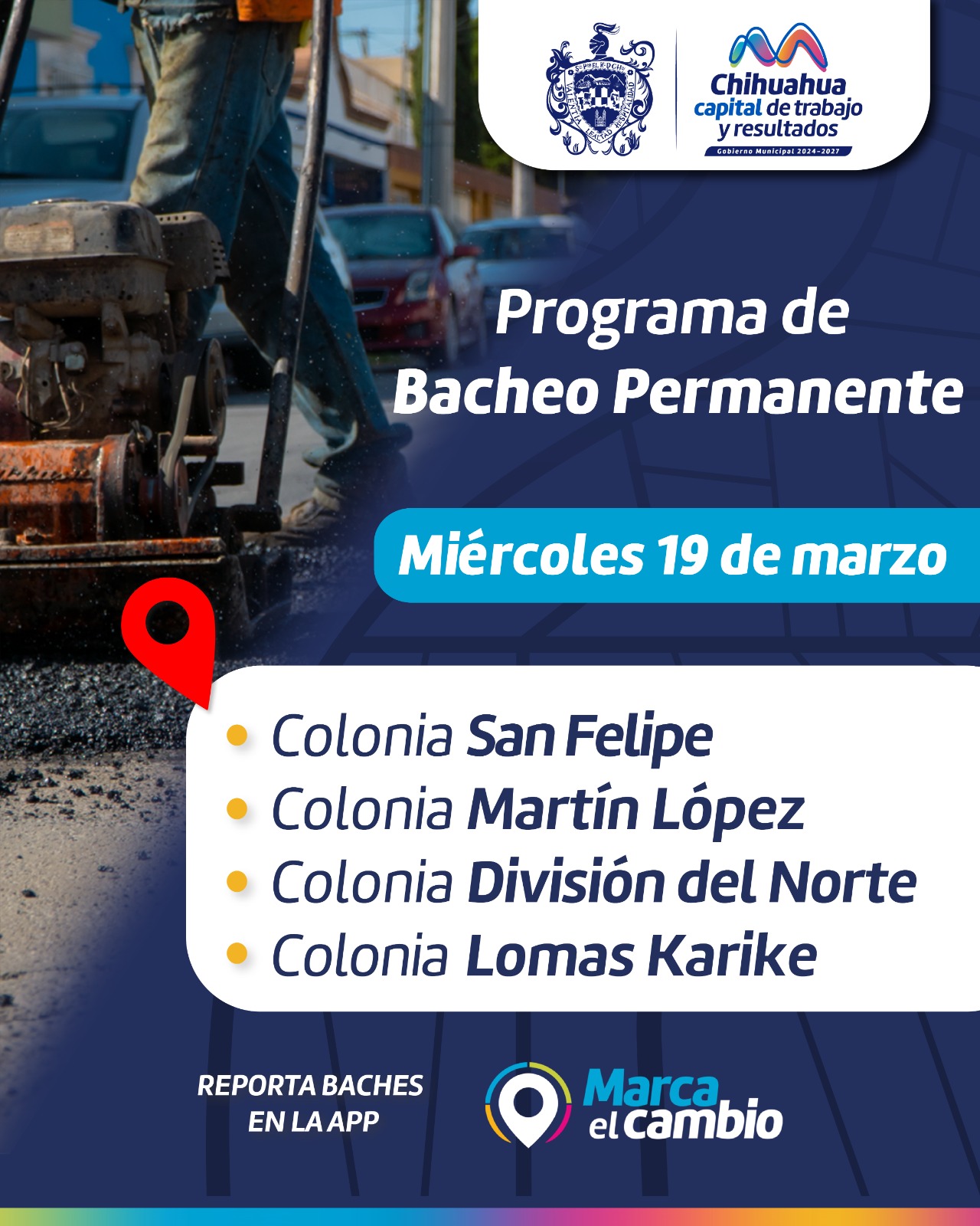_*Chihuahua, Chih., a 19 de marzo del 2025.-*_ El Gobierno Municipal, a través de la Dirección de Obras Públicas, trabajará con bacheo este 19 de marzo en calles de las colonias San Felipe, Martín López, División del Norte y Lomas Karike.