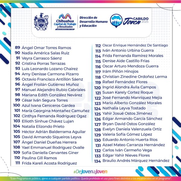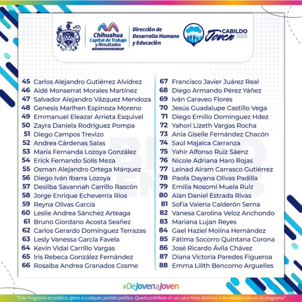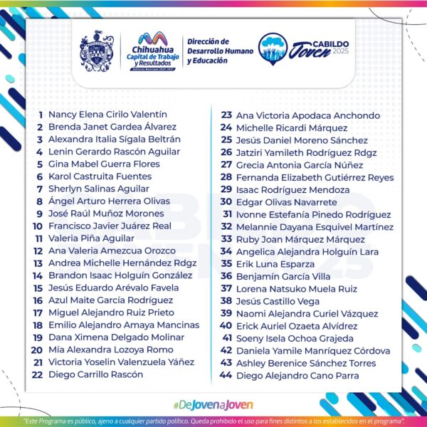 H. Ciudad de Chihuahua, Chih., a 7 de julio de 2025.- El Gobierno Municipal de Chihuahua, a través de la Dirección de Desarrollo Humano y Educación y su Subdirección de Atención a la Juventud, da a conocer a los ganadores para participar en Cabildo Joven en su edición 2025.