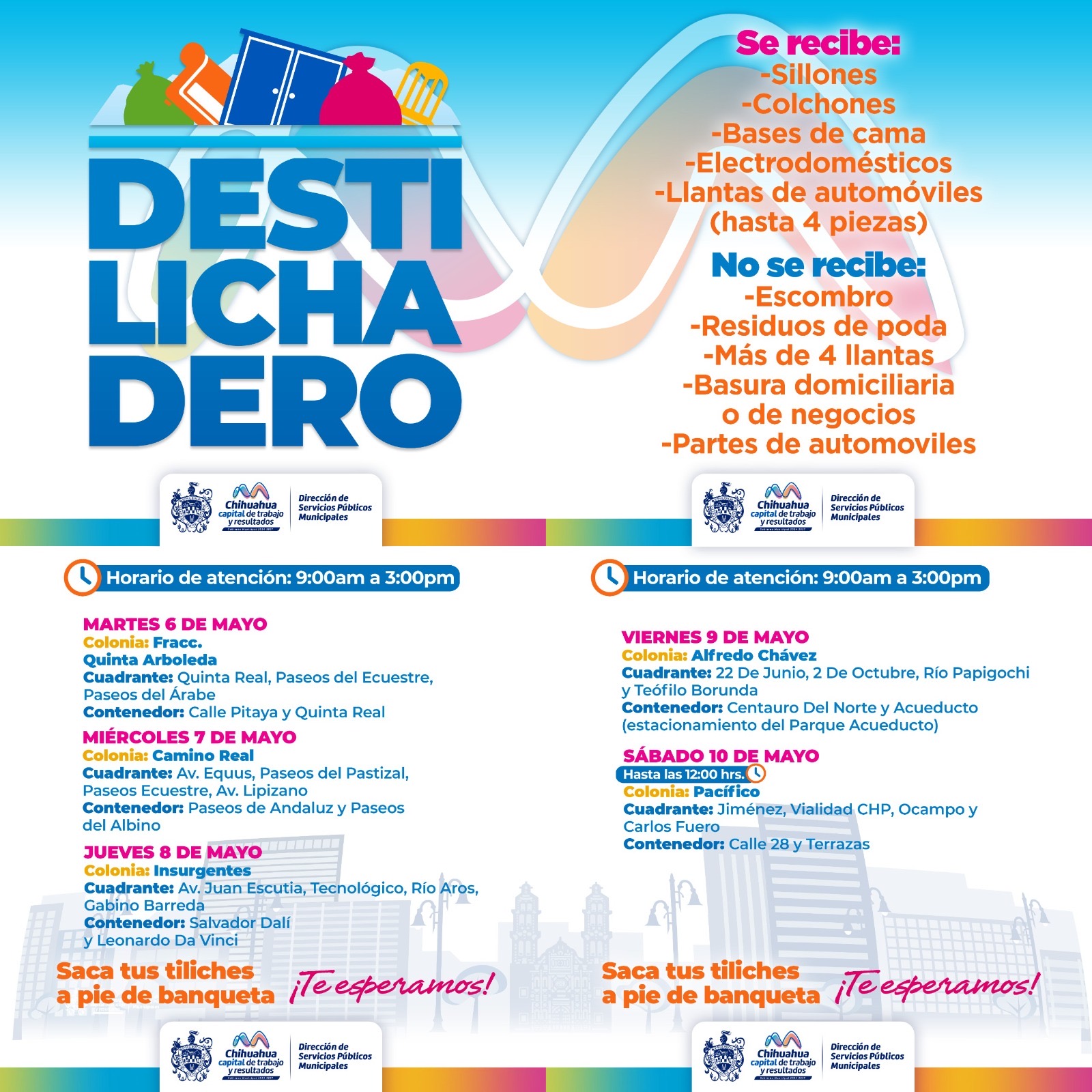 H. Ciudad de Chihuahua, Chih. A 3 de mayo de 2025_*.- Para evitar acumulaciones de basura de grandes dimensiones en las viviendas, que podría generar plagas o problemas de salud, el Gobierno Municipal, a través de la Dirección de Servicios Públicos Municipales, informa el calendario del programa Destilichadero, que se realizará del 6 al 10 de mayo en cinco colonias de la Capital.