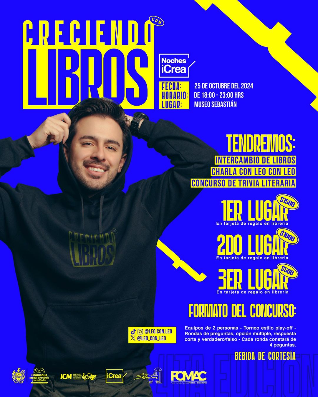 Chihuahua, Chih. A 16 de octubre de 2024.- El Gobierno Municipal de Chihuahua invita a participar en la cuarta edición de Noches iCrea, bajo el tema “Creciendo con Libros”, que se llevará a cabo el próximo 25 de octubre de 2024, de 6:00 a 11:00 horas, en el Museo Sebastián.