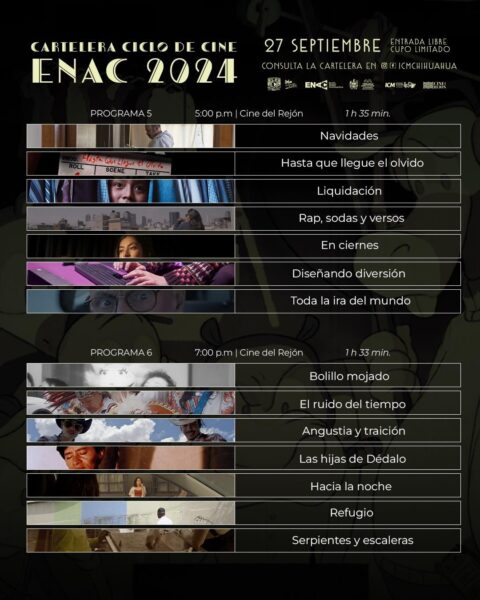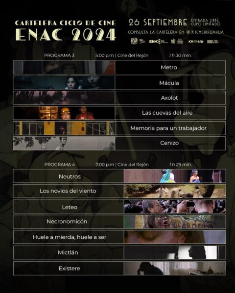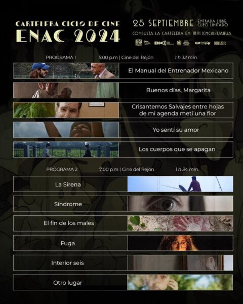 Chihuahua, Chih., a 23 de septiembre de 2024.- El Instituto de Cultura del Municipio, invita a disfrutar del “Ciclo de Cine ENAC 2024”, evento cinematográfico que se realizará del 25 al 28 de septiembre en el Cine del Rejón, donde se proyectarán 30 cortometrajes y un largometraje de diversos temas, realizados por estudiantes y egresados de la Escuela Nacional de Artes Cinematográficas (ENAC).