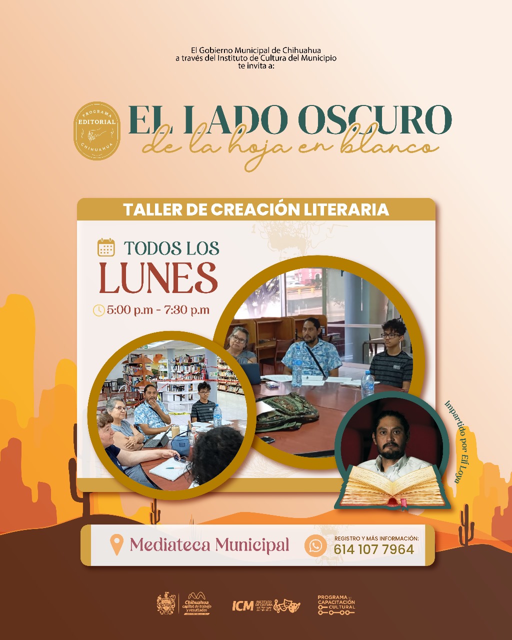 Chihuahua, Chih. A 12 de septiembre de 2024.- El Gobierno Municipal, a través del Instituto de Cultura, invita a todos los interesados en la literatura y la escritura creativa, a participar en el taller “El Lado Oscuro de la Hoja en Blanco”, que se llevará a cabo todos los lunes de 5:00 p.m. a 7:30 p.m. en la Mediateca Municipal.