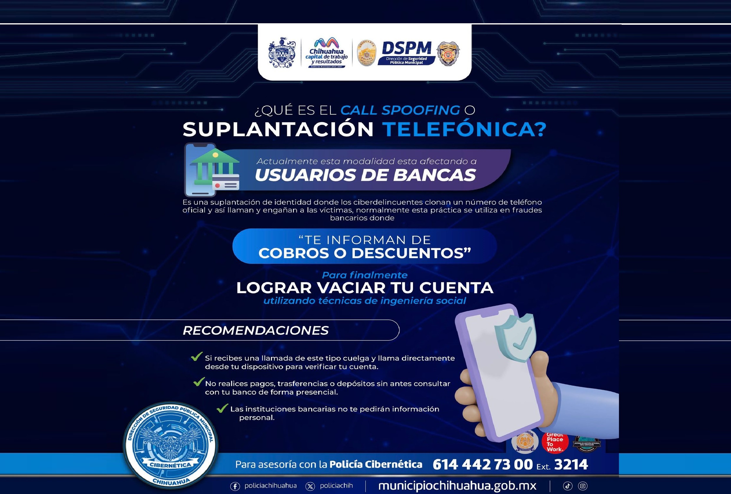 Chihuahua, Chih., a 28 de marzo de 2025.- Con el objetivo de prevenir que las personas sean defraudadas con información personal o incluso con su patrimonio, la Policía Cibernética del Municipio emite recomendaciones para evitar caer en “spoofing” o suplantación de identidad.