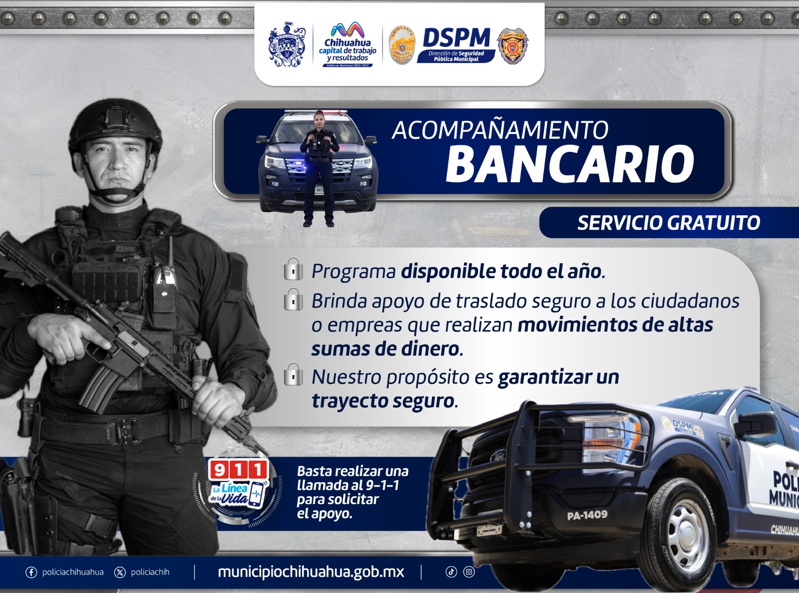 Chihuahua, Chih. A 6 de marzo de 2025.- Con la finalidad de cuidar el patrimonio de las y los chihuahuenses, el Gobierno Municipal continúa ofreciendo el Programa de Acompañamiento Bancario, un servicio totalmente gratuito para la comunidad, que se brinda desde hace varios años para resguardar al usuario mientras traslada fuertes sumas de dinero de un punto a otro de la ciudad.