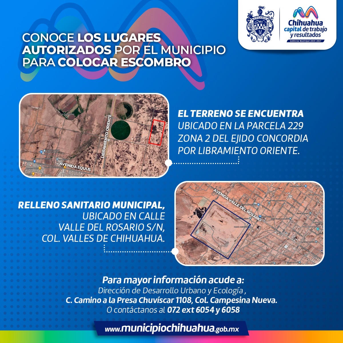 _*H. Ciudad de Chihuahua, Chih., a 27 de junio de 2025.-*_ El Gobierno Municipal, a través de la Dirección de Desarrollo Urbano y Ecología, hace un llamado a la ciudadanía para colaborar en el cuidado del entorno depositando el escombro únicamente en los sitios autorizados.