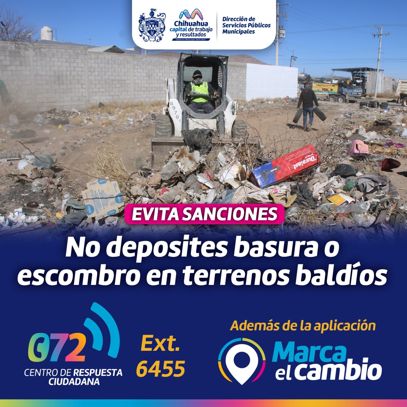 _*H. Ciudad de Chihuahua, Chih., a 10 de abril de 2025.-*_ Con el objetivo de mantener una buena imagen urbana, el Gobierno Municipal a través de la Dirección de Servicios Públicos Municipales, exhorta a la población en general a evitar tirar basura o escombro en viviendas abandonadas y terrenos baldíos de la ciudad.