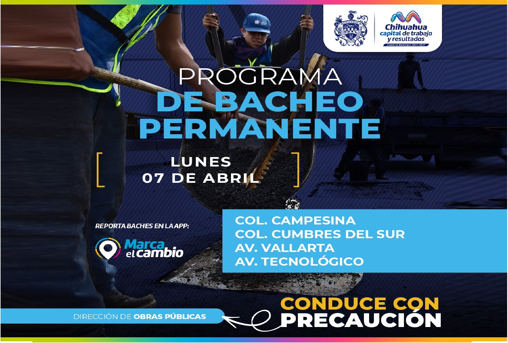 Chihuahua, Chih. A 7 de abril del 2025.- El Gobierno Municipal a través de la Dirección de Obras Públicas, continúa trabajando con el Programa Permanente de bacheo, por lo que exhorta a los ciudadanos tomar precauciones hoy lunes en las colonias Campesina y Cumbres del Sur, así como en las avenidas Vallarta y Tecnológico, donde estarán trabajando las cuadrillas.