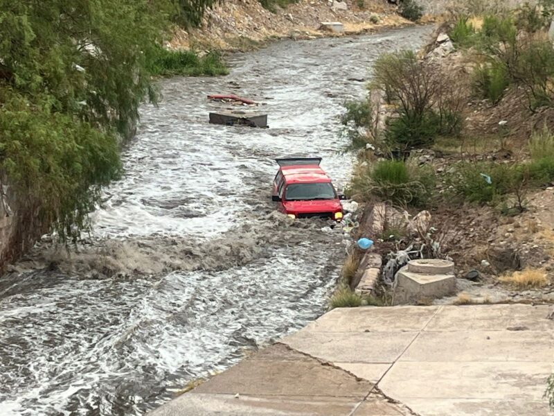 Una vehículo pick up de color rojo fue arrastrada parcialmente por la corriente al interior del cauce tras una creciente repentina. El conductor, un hombre de 55 años, ya se encontraba fuera del vehículo al momento de la atención. No se reportaron personas lesionadas.