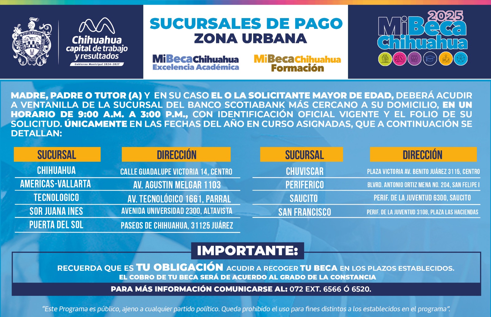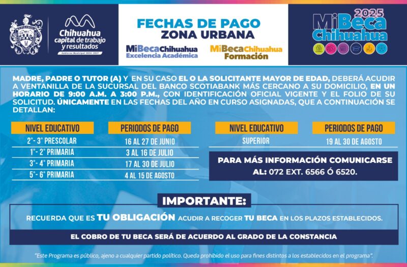 *_H. Ciudad de Chihuahua, Chih. A 11 de junio de 2025_*.- El Gobierno Municipal, a través de la Dirección de Desarrollo Humano y Educación, da a conocer a todos los beneficiarios de “Mi Beca Chihuahua Excelencia Académica y Formación” el procedimiento para realizar el cobro de este apoyo.