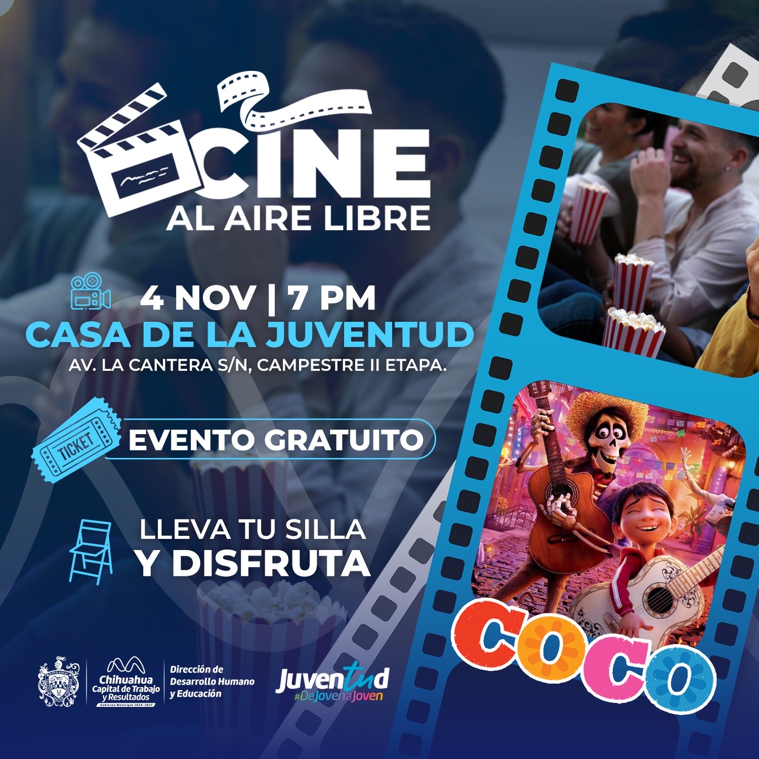 *_H. Ciudad de Chihuahua, Chih., a 29 de octubre de 2025_*.– El Gobierno Municipal de Chihuahua, a través de la Dirección de Desarrollo Humano y Educación, invita a toda la ciudadanía a disfrutar de la proyección al aire libre de la película “Coco”, el próximo 4 de noviembre de 2025 en la Casa de la Juventud ubicada en la avenida de la Cantera sin número a partir de las 19:00 horas.