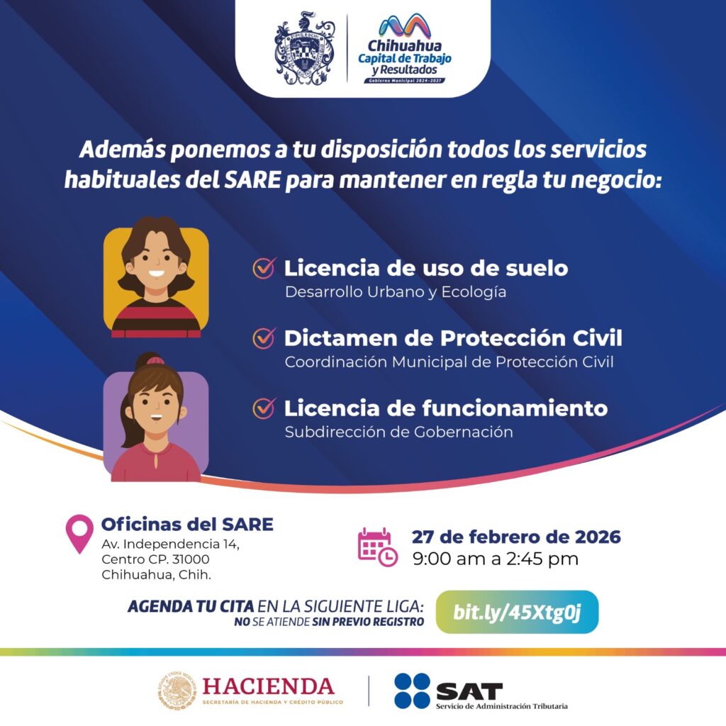 *_H. Ciudad de Chihuahua, Chih., a 12 de febrero de 2026_*.- El Gobierno Municipal de Chihuahua, a través de la Dirección de Desarrollo Económico y Competitividad en colaboración con el Servicio de Administración Tributaria (SAT), informa a la población que el próximo viernes 27 de febrero podrán realizar trámites fiscales y administrativos para personas físicas en las instalaciones del SARE.