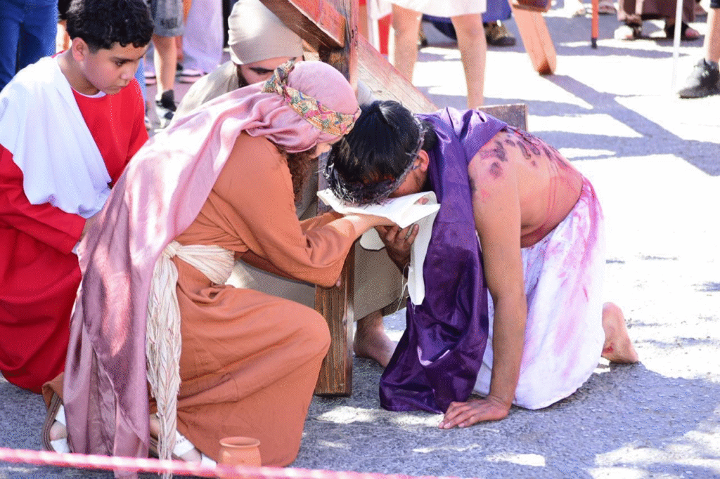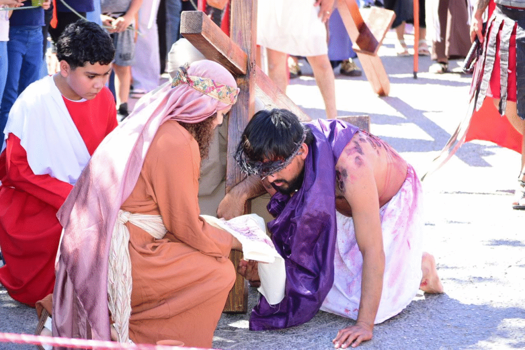 Durante el recorrido se representaron las caídas de Jesús bajo el peso de la cruz, evocando las palabras: “Mas él herido fue por nuestras rebeliones, molido por nuestros pecados”, uno de los pasajes más citados durante estas fechas. Cada estación fue seguida por decenas de personas que acompañaron el trayecto en silencio.