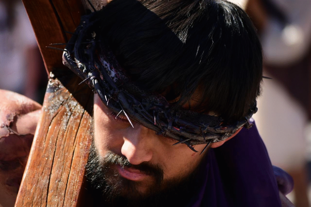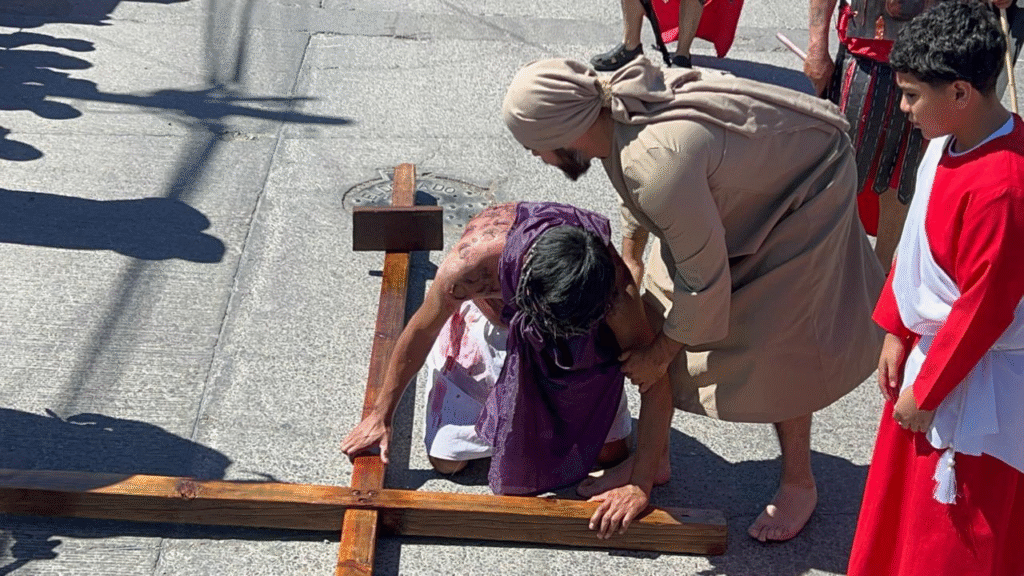 El papel de Jesucristo fue interpretado por Carlos Estrada, quien encabezó el viacrucis cargando la cruz a lo largo de varias calles, recreando el momento descrito en el evangelio: “Y él, cargando su cruz, salió hacia el lugar llamado de la Calavera”. La escena estuvo marcada por el esfuerzo físico y la intensidad emocional, mientras los asistentes seguían cada paso.