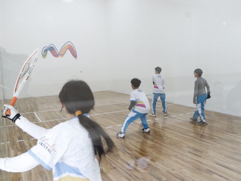 Además, se construyó un edificio de ráquetbol a base de muros de block de concreto, columnas, losas y trabes de concreto armado, dos canchas de ráquetbol con duela de madera y barniz como acabado final, y paredes de cristal tipo estadio.