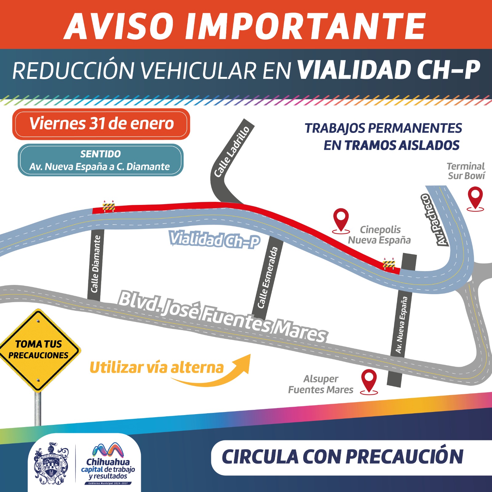 Chihuahua, Chih., a 21 de enero de 2025.- El Gobierno Municipal, por medio de la Dirección de Obras Públicas, informa que a partir del viernes 31 de enero se reducirá la circulación vehicular en vialidad CH-P, en tramos aislados desde la avenida Nueva España a calle Diamante, por el inicio de reposición de losas de concreto, por lo que se exhorta a conducir con precaución por las zonas de trabajo.