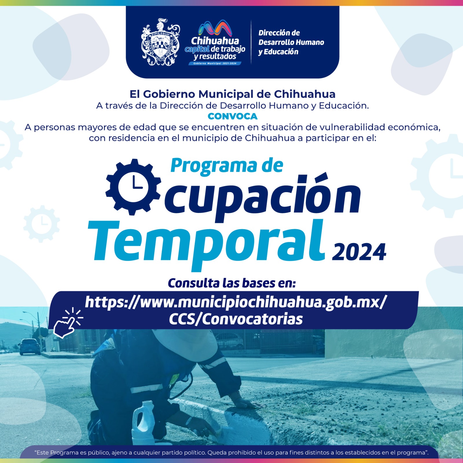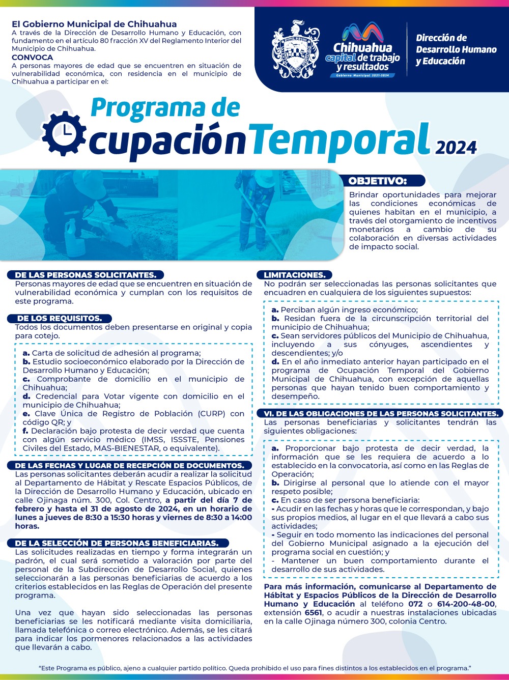 Chihuahua, Chih. A 06 de febrero de 2024.- El Gobierno Municipal, a través de la Dirección de Desarrollo Humano y Educación, recuerda que a partir de mañana 7 de febrero, y hasta el 31 de agosto, puedes aplicar para ser parte del Programa de Ocupación Temporal.