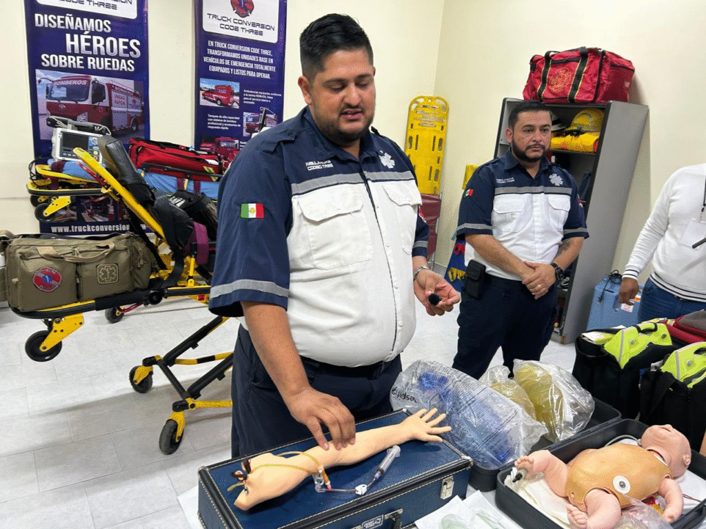 La Academia de Paramédicos Código Tres presentó este miércoles avances en la capacitación de técnicos en urgencias médicas, destacando el uso de maniquíes de simulación de alta gama para la atención de pacientes pediátricos, un área crítica en emergencias. Alejandro Peña, coordinador académico, y Adolfo Ruiz, instructor especializado, explicaron que estos simuladores permiten a los estudiantes practicar desde la canalización de vías intraóseas y venosas hasta la resucitación cardiopulmonar (RCP) y manejo de vías aéreas difíciles en lactantes y niños, replicando escenarios reales con signos vitales, ritmos respiratorios y respuestas a medicamentos. “Este maniquí nos ayuda a simular situaciones críticas, como un paro respiratorio o un atragantamiento en un bebé, donde los alumnos aprenden a responder con precisión en los primeros cinco minutos, que son decisivos para la supervivencia”, explicó Peña, mientras demostraba el uso de una cánula orofaríngea y técnicas de ventilación asistida en el simulador infantil. Ruiz añadió que el equipo incluye monitores de electrocardiograma, desfibriladores automáticos y ventiladores de alta gama con CPAP, herramientas esenciales para entrenar a los futuros paramédicos en protocolos avanzados.
