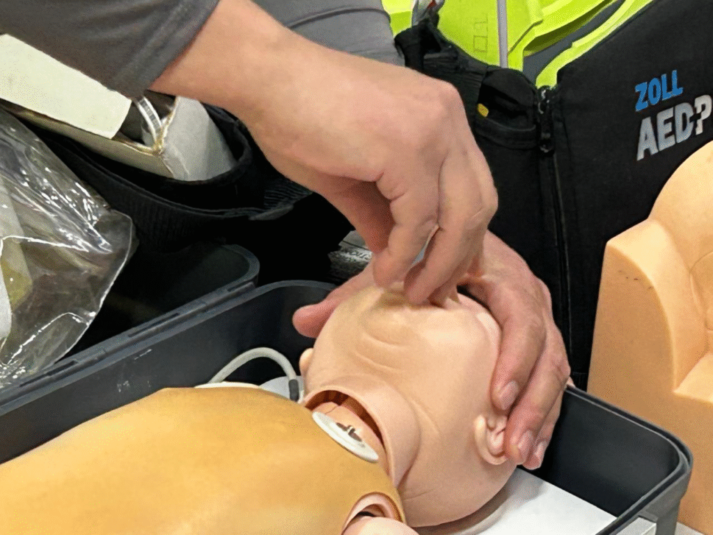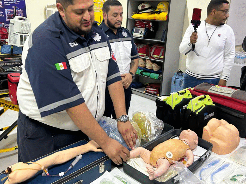 La academia también promueve talleres de primer respondiente para el público en general, enfocados en técnicas como la maniobra de Heimlich y el uso de desfibriladores automáticos, equipos que, según Peña, “no son caros y pueden salvar vidas”. “En gimnasios, centros comerciales como Fashion Mall, el aeropuerto y Expo Chihuahua ya hay desfibriladores disponibles, pero falta cultura para usarlos. Queremos que la gente sepa dónde están y cómo operarlos”, subrayó, mientras mostraba un desfibrilador portátil durante la demostración.