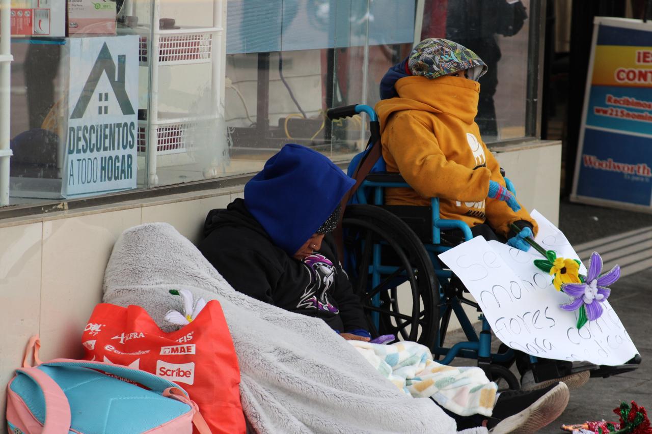 Entre ellos destaca una mujer que, desde su silla de ruedas, ofrece flores elaboradas a mano con materiales reciclados, un esfuerzo creativo para captar la atención de quienes pasan por el lugar mientras ajusta su cobija para protegerse del viento helado. Los tres, envueltos en capas de ropa, representan a un sector de la población que, pese a su edad y limitaciones físicas, se ve obligado a exponerse a las inclemencias del tiempo para subsistir.