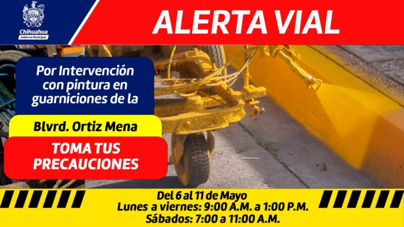 La Dirección de Mantenimiento Urbano, continuará realizando intervenciones de pintura en las guarniciones del boulevard Ortiz Mena, del 6 al 11 de mayo, entre el Periférico De la Juventud hasta la avenida Las Américas, de lunes a viernes de 9:00 am a 1:00 pm y los sábados de 7:00 am a 11:00 am.