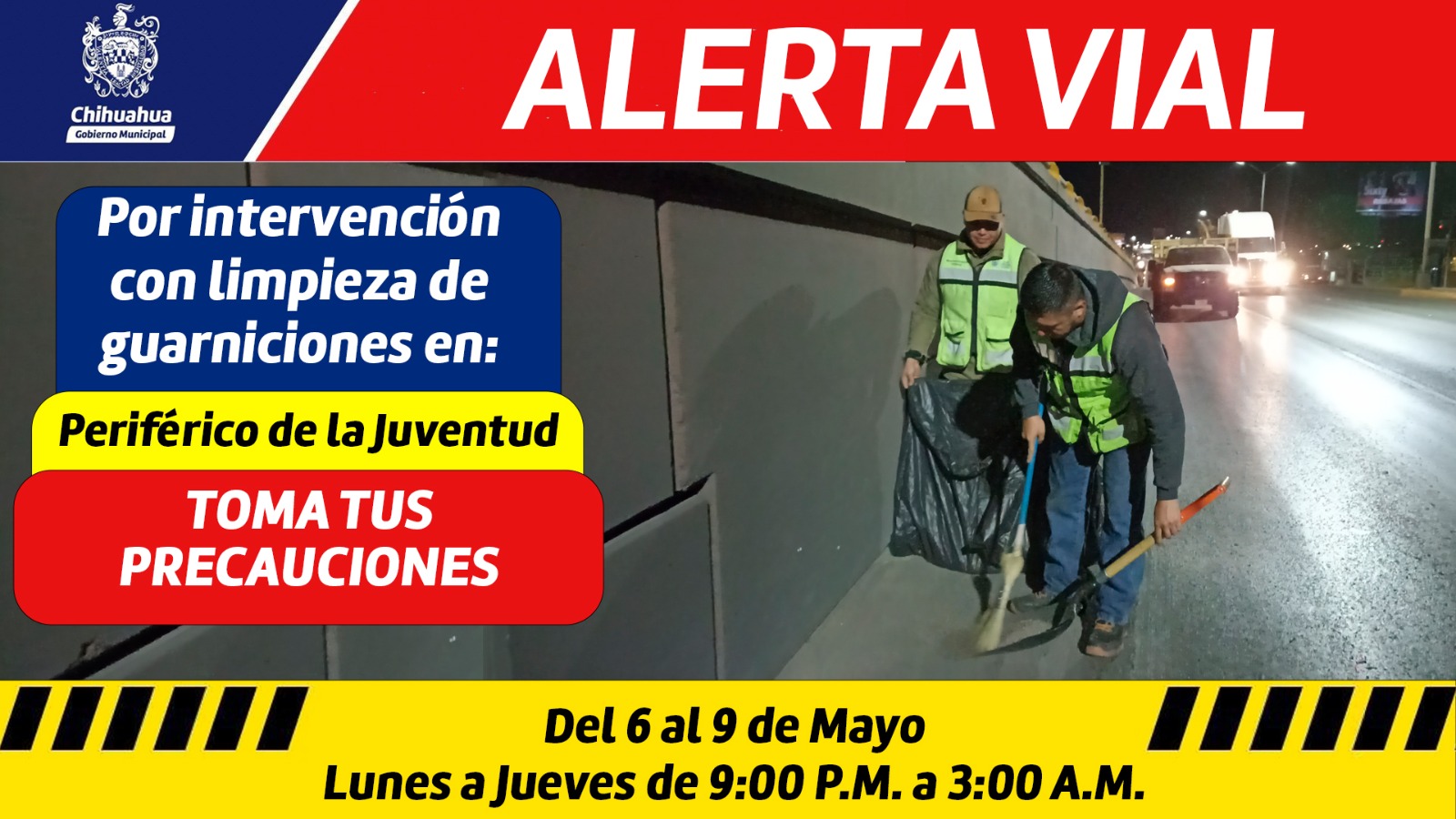De igual manera, la Dirección de Mantenimiento Urbano, da a conocer que personal de la dependencia estará realizando limpieza nocturna en los puentes del Periférico De la Juventud del lunes 6 al miércoles 8 de mayo, a la altura de la calle Egipto hasta la calle la Ignacio Rodríguez, de 9:00 pm a 3:00 am.