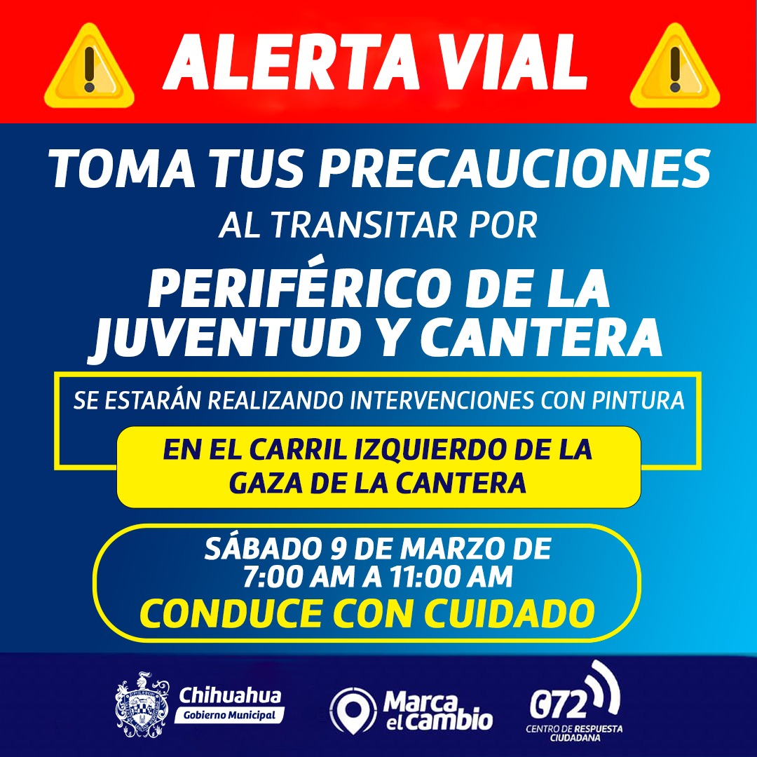 Chihuahua, Chih. A 05 de marzo de 2024.- El Gobierno Municipal, a través de la Dirección de Mantenimiento Urbano, informa a la ciudadanía que el próximo sábado 9 de marzo, se realizarán labores de pintura en el muro de contención de la gaza que se ubica en el Periférico de la Juventud y avenida La Cantera.