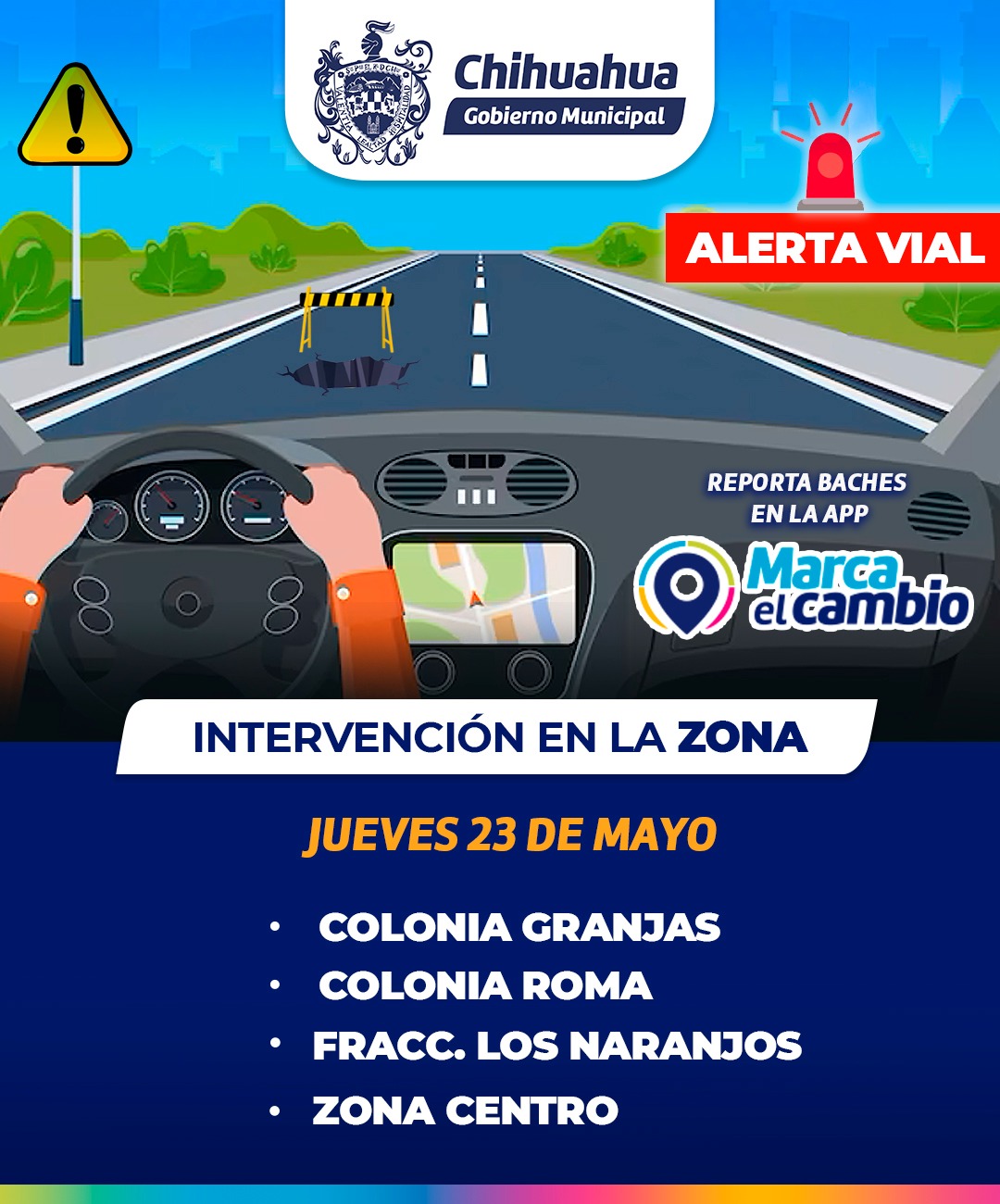 Chihuahua, Chih. A 23 de mayo de 2024.-* El Gobierno Municipal, a través de la Dirección de Obras Públicas, informa a la población sobre la intervención que se realizará en calles de las colonias Granjas, Roma, fraccionamiento Los Naranjos y en la Zona Centro.