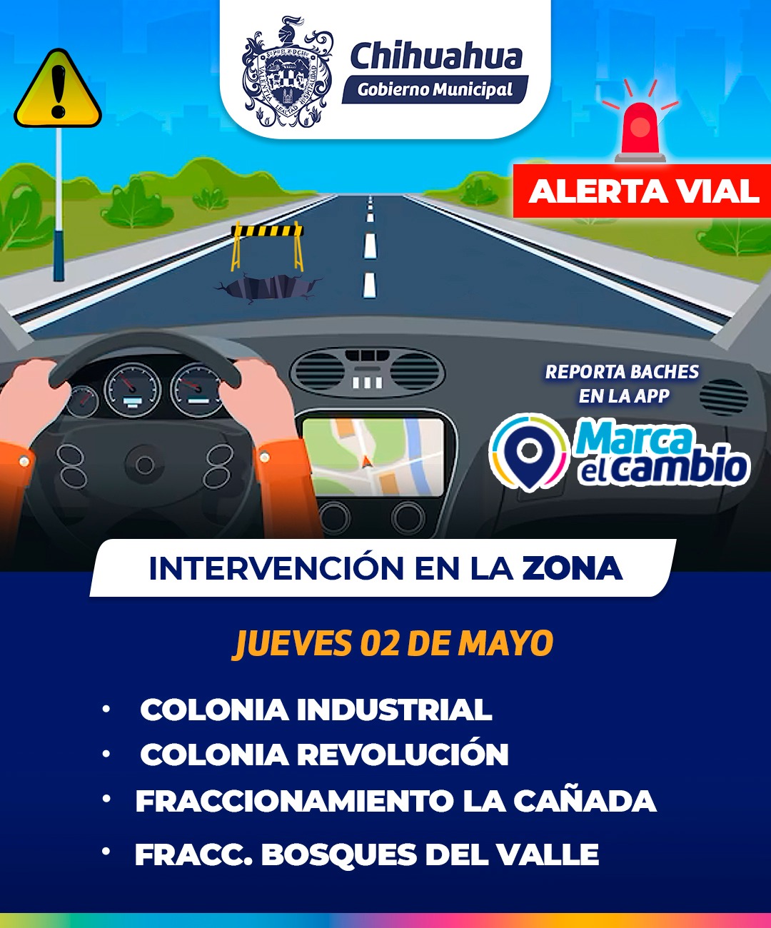 Chihuahua, Chih. A 02 de mayo de 2024.- Por una circulación segura en la Capital, el Gobierno Municipal, a través de la Dirección de Obras Públicas realizará intervención en las colonias Industrial, Revolución y en los fraccionamientos La Cañada y Bosques del Valle.