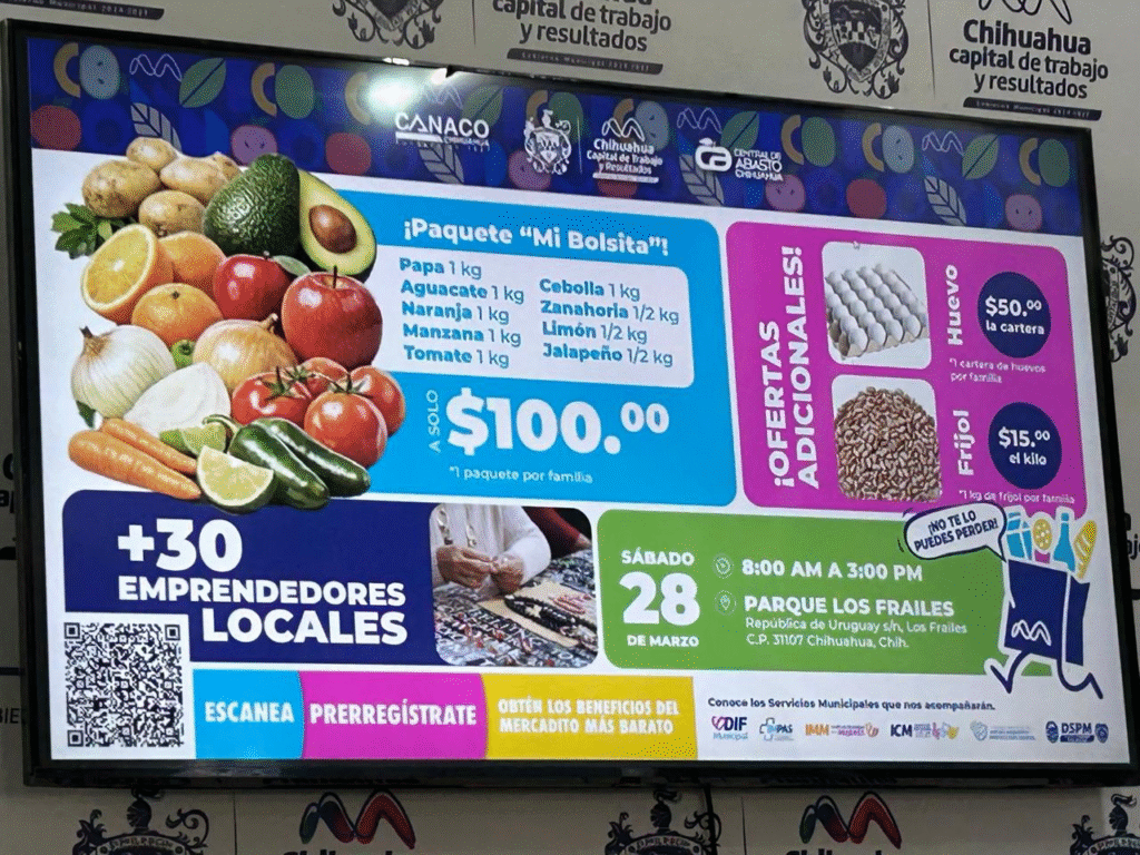 El Gobierno Municipal de Chihuahua, en coordinación con la Cámara Nacional de Comercio (CANACO) y la Central de Abastos, anunció la realización del programa “Mercadito Más Barato”, una estrategia enfocada en ofrecer productos de la canasta básica a precios accesibles para las familias de la capital.