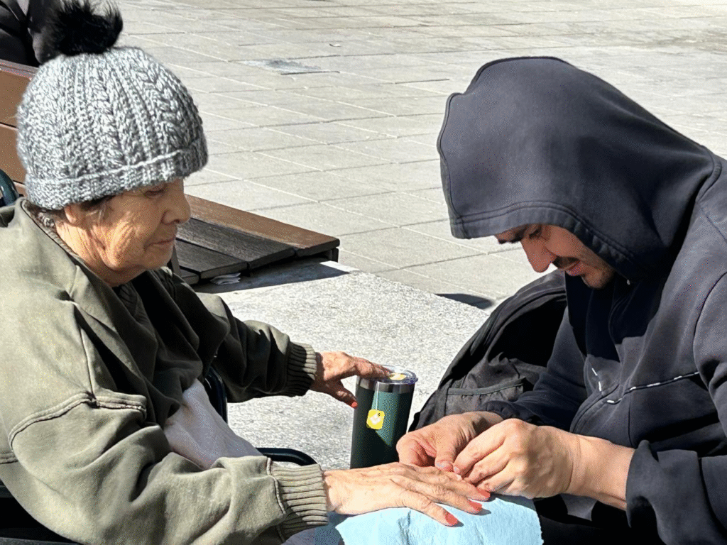 Su dedicación es un ejemplo de amor filial y resiliencia, en un espacio público que se ha convertido en su segundo hogar.