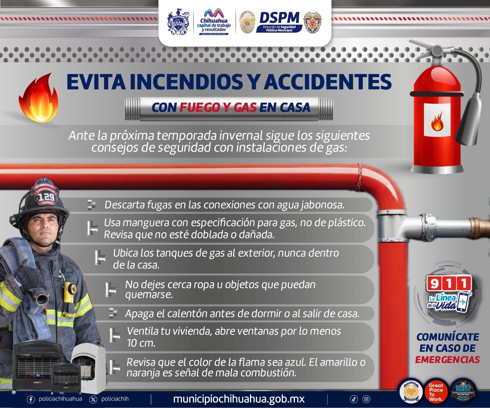 Chihuahua, Chih., a 24 de octubre de 2024.- Ante la llegada de los primeros frentes fríos en la Capital, la Dirección de Seguridad Pública Municipal (DSPM), a través del Heroico Cuerpo de Bomberos, pide a la ciudadanía revisar sus calentones a gas y brindarles el mantenimiento adecuado que deben recibir cada año para evitar accidentes.