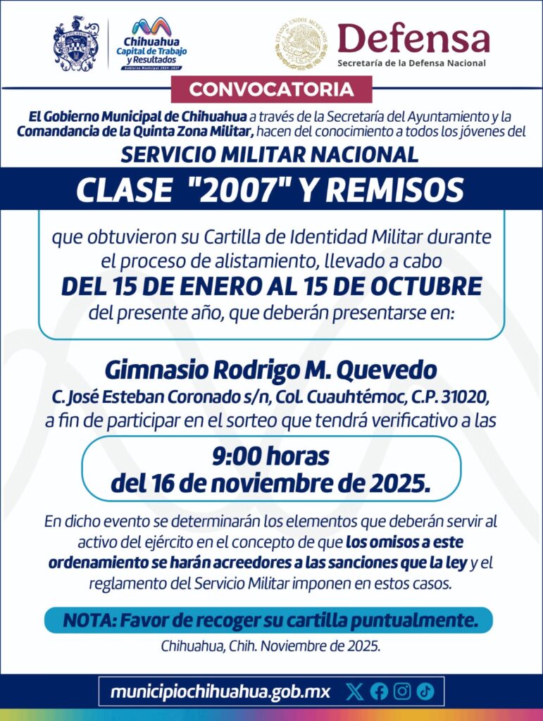 H. Ciudad de Chihuahua, Chih., a 4 de noviembre de 2025.- El Gobierno Municipal de Chihuahua, a través de la Junta Municipal de Reclutamiento, adscrita a la Secretaría del Ayuntamiento, informa que el próximo domingo 16 de noviembre se llevará a cabo el sorteo del Servicio Militar Nacional (SMN), correspondiente a la clase 2007 y remisos, en las instalaciones del Gimnasio Rodrigo M. Quevedo.