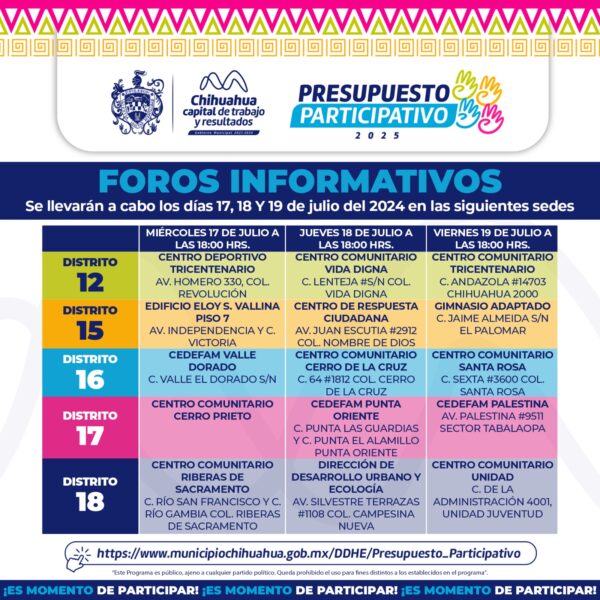 Chihuahua, Chih. A 15 de julio de 2024.- El Gobierno Municipal, a través de la Dirección de Desarrollo Humano y Educación, invita a participar en el Presupuesto Participativo edición 2025, donde se iniciará con la primera fase con foros informativos y la recepción de propuestas.