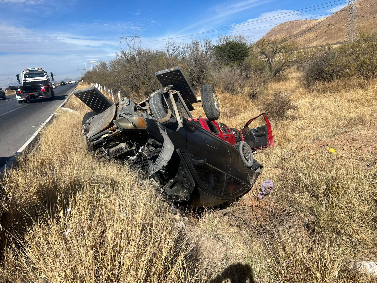 Aparatosa doble volcadura en la carretera Delicias–Chihuahua; dos vehículos quedan uno sobre otro