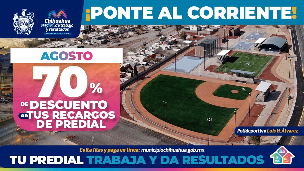 Chihuahua, Chih. A 13 de agosto de 2024.- El Gobierno Municipal, a través de la Tesorería, invita a la ciudadanía a aprovechar el descuento del 70 por ciento que se tiene en los recargos del Impuesto Predial en agosto, para personas físicas y morales.
