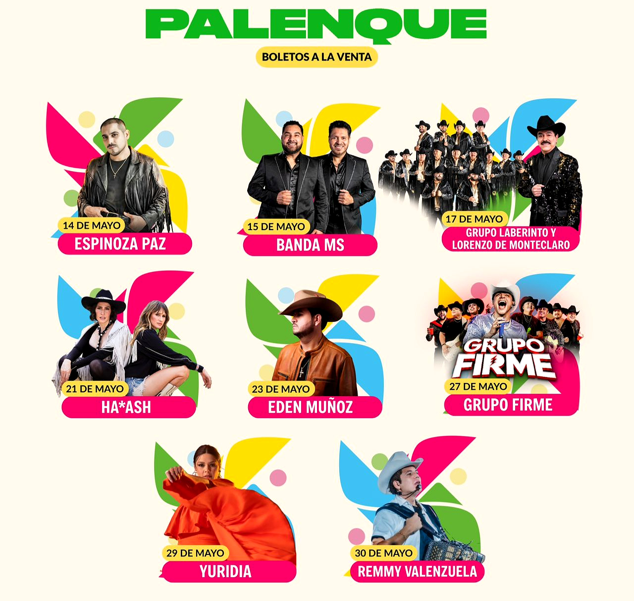Entre los artistas destacados que formarán parte de esta gran celebración se encuentran Banda MS, que el 15 de mayo llenará el recinto con sus éxitos que han marcado a toda una generación. El 17 de mayo, Grupo Laberinto y Lorenzo de Monteclaro ofrecerán una velada llena de nostalgia y pasión por la música norteña y ranchera. El 21 de mayo, HA*ASH llegará para conquistar al público con su estilo único y su mezcla de pop y country. El 23 de mayo, Eden Muñoz cautivará a los asistentes con su poderosa voz y su carisma en el escenario. El 27 de mayo, Grupo Firme revolucionará el Palenque con su frescura y sus ritmos contagiosos. El 29 de mayo, Yuridia, la reina indiscutible del Palenque, regresará para emocionar a todos con su poderosa voz y su conexión única con el público.
