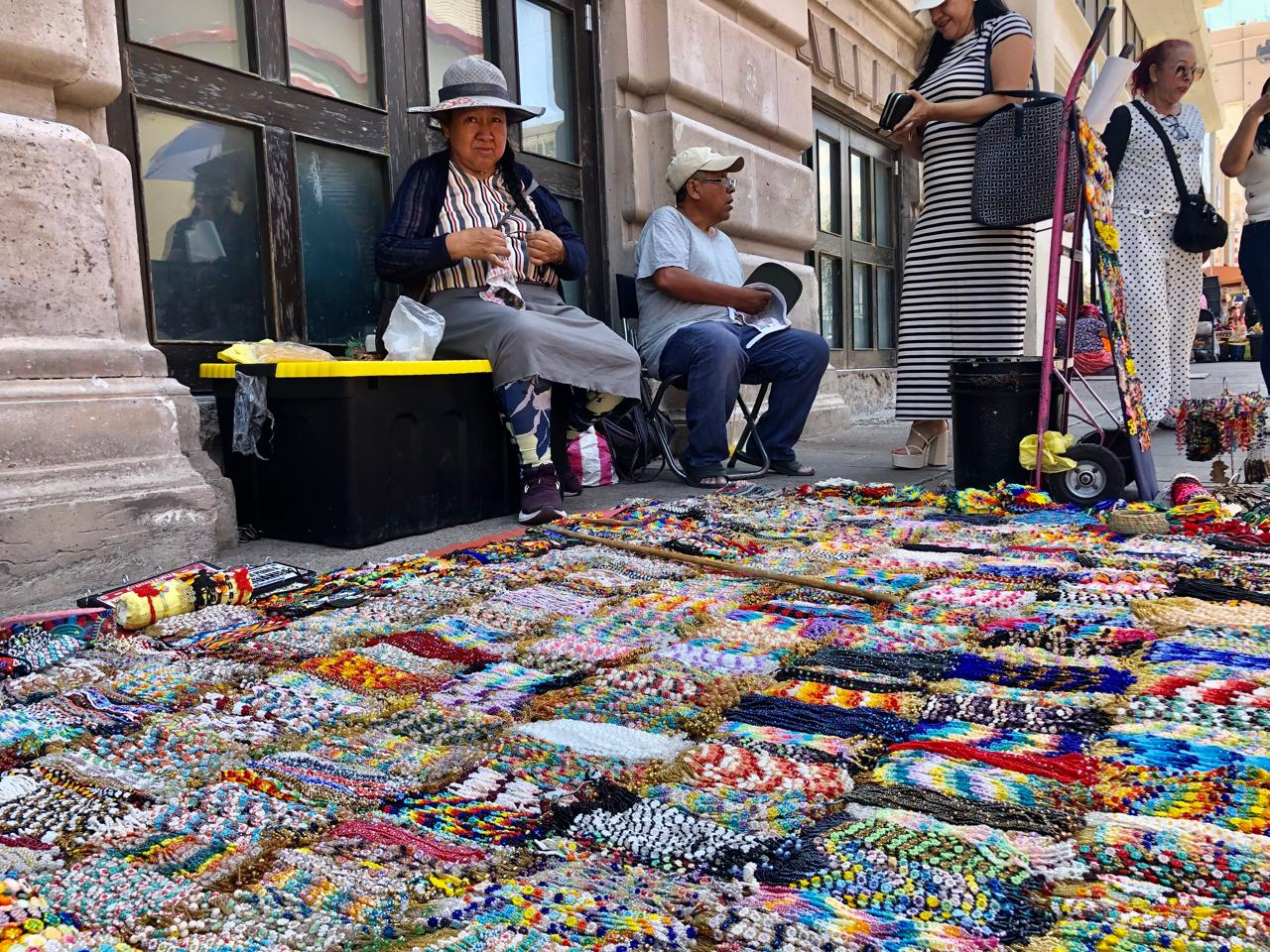 En el Paseo Victoria, entre las calles Tercera y Quinta del centro de la ciudad, artesanos otomíes provenientes de Puebla exhiben desde esta mañana sus productos elaborados completamente a mano, una tradición que, según ellos, los distingue de otros vendedores que ofrecen artículos fabricados con máquinas.