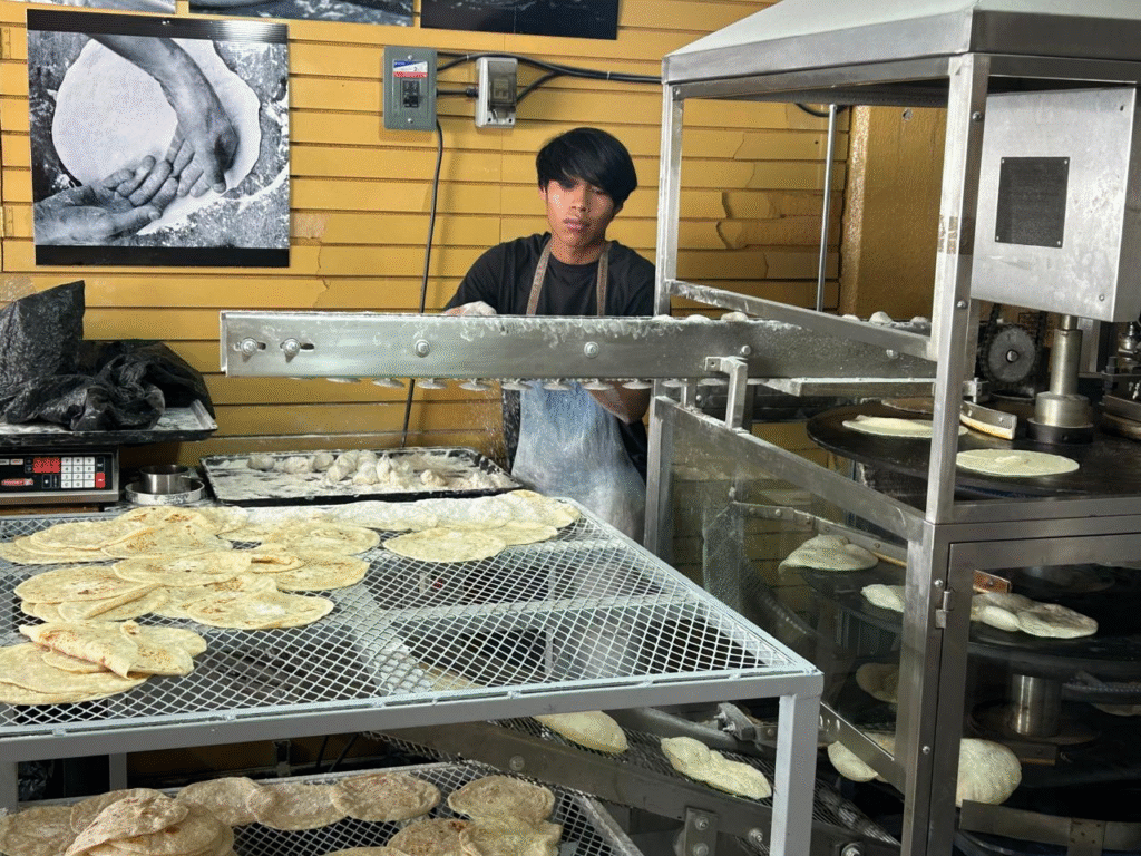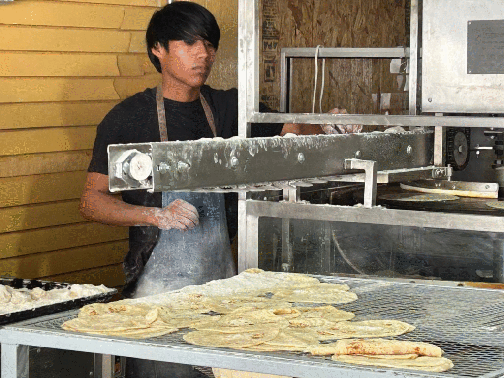 El corazón de su operación es una máquina tortilladora de harina, adquirida en la ciudad, que funciona con un sistema de prensa giratoria y un comal rotativo para garantizar una cocción uniforme. Según los dueños, este equipo es capaz de producir 400 tortillas en solo 20 minutos, una eficiencia clave para mantener el ritmo de producción necesario. Las tortillas se venden empaquetadas en presentaciones de 23, 25 y 28 unidades, tanto en su versión tradicional de harina como en la opción integral, mientras que también venden burritos.