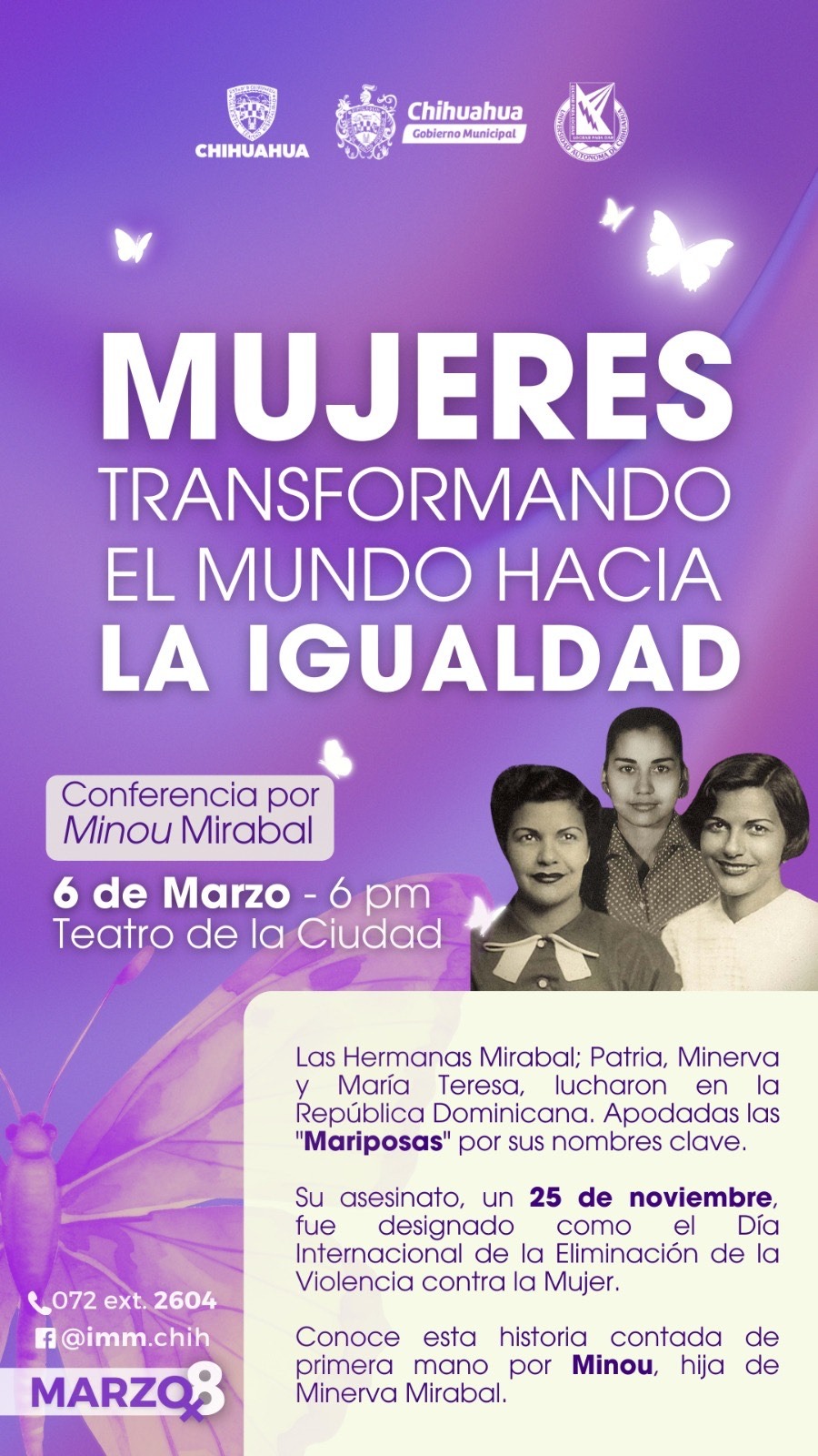 Chihuahua, Chih. A 04 de marzo de 2024.- El Gobierno Municipal de Chihuahua, a través del Instituto Municipal de las Mujeres, te recuerda que este 6 de marzo se realizará la conferencia “Mujeres transformando el mundo hacia la igualdad” con Minou Mirabal, hija de Minerva Mirabal.