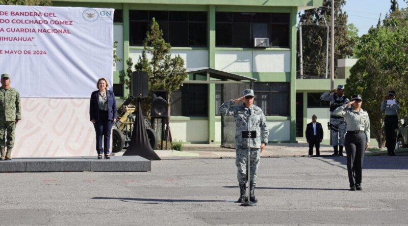 Chihuahua, Chih. A 17 de mayo de 2024.- La gobernadora Maru Campos, y el alcalde, Jorge Cruz Russek, asistieron a la toma de protesta como coordinador estatal de la Guardia Nacional en Chihuahua, del comisario jefe, Fernando Colchado Gómez, en el evento también se hizo el saludo de mandos y protesta de bandera.