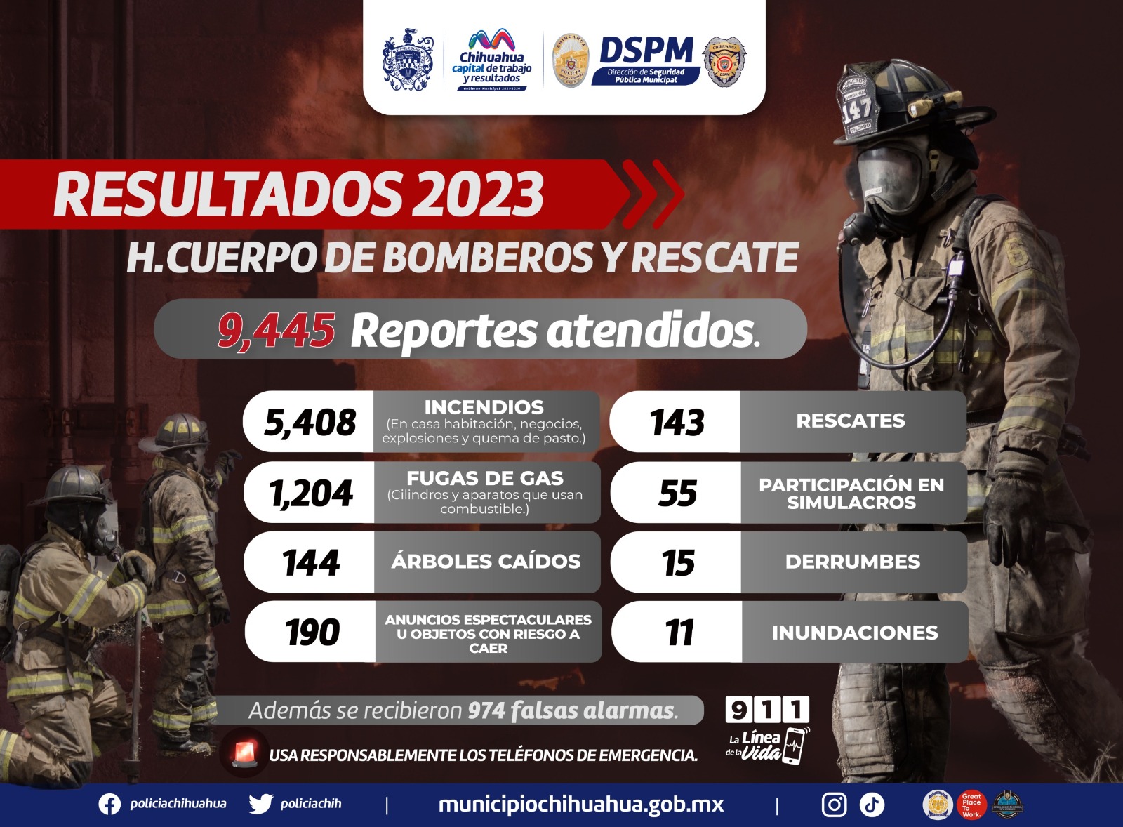 Chihuahua, Chih. 18 de enero de 2024.- Gracias a la oportuna intervención de mujeres y hombres que conforman el Heroico Cuerpo de Bomberos y Rescate del Municipio, casi 10 mil eventos fueron atendidos en la ciudad durante el año 2023, entre los cuales destacan incendios de pasto y basura, explosiones, atenciones por fugas de gas, así como rescates de personas en diversas circunstancias.
