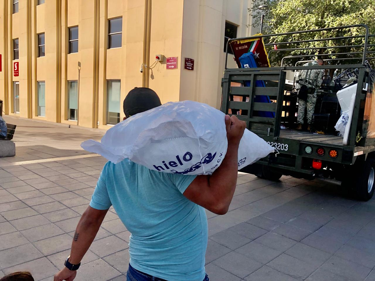 En una de las imágenes captadas durante la jornada, un trabajador aparece subiendo costales de hielo a una unidad de la Secretaría de la Defensa Nacional (SEDENA). Se presume que el hielo sería destinado a una carpa de vacunación instalada como parte de una jornada de salud pública, organizada en coordinación con otras dependencias, para atender a la población durante esta temporada.