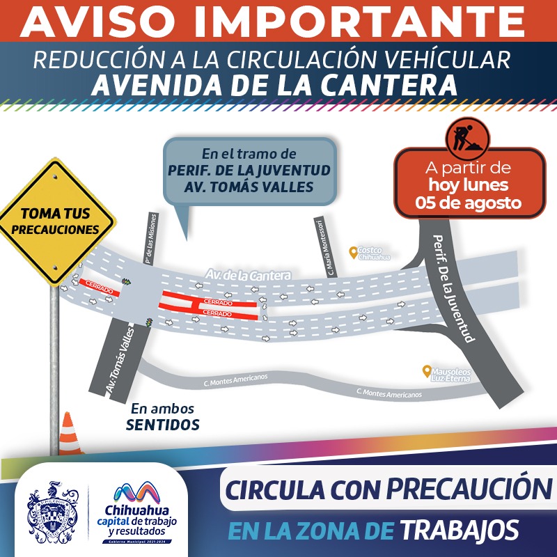 Hoy lunes 5 de agosto de 2024, el Gobierno Municipal de Chihuahua ha anunciado una reducción en la circulación vehicular en la Avenida de la Cantera debido a trabajos de construcción.