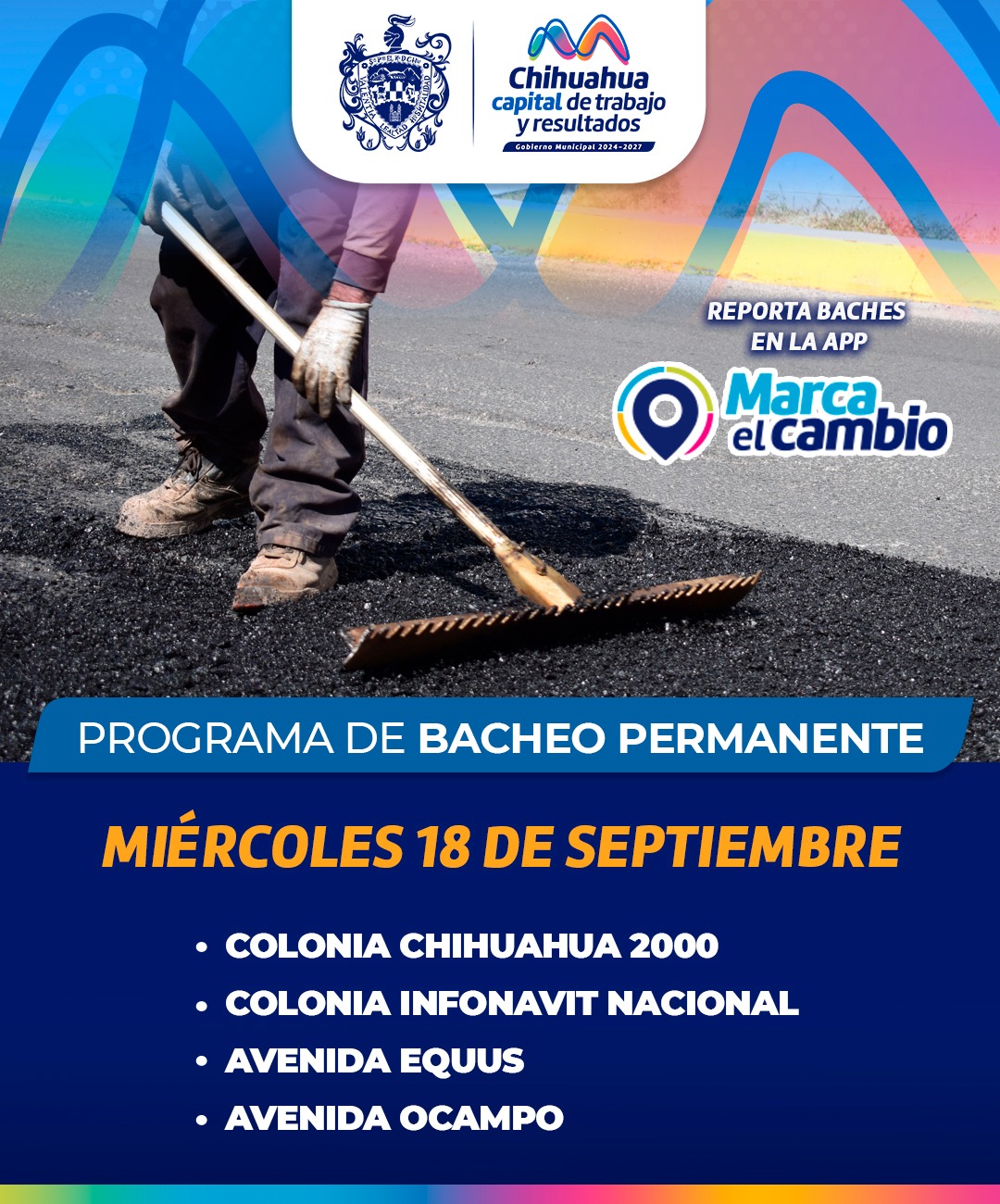 Chihuahua, Chih. A 18 de septiembre de 2024.- Para mantener la superficie de rodamiento en calles y avenidas de la capital en optimas condiciones, el Gobierno Municipal, realizará trabajos de bacheo hoy miércoles en calles de las colonias Chihuahua 2000, Infonavit Nacional y en las avenidas Equus y Ocampo.