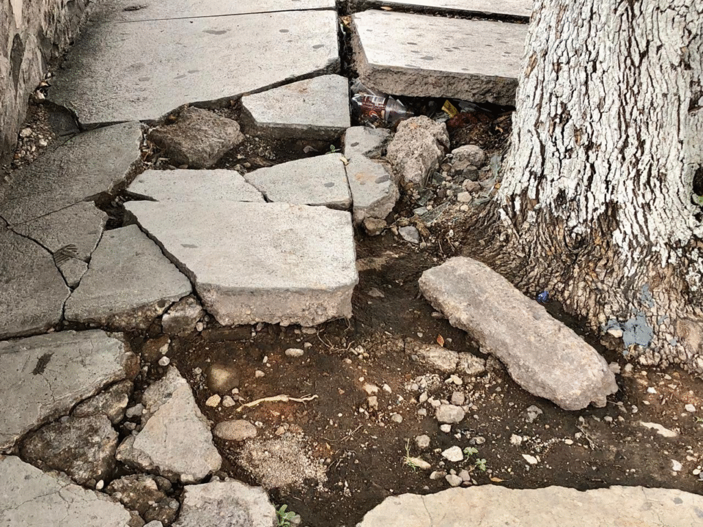 Banqueta destruida y bache gigante en Neri Santos y Ángel Trías