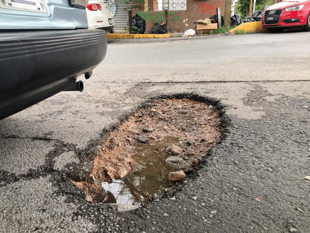 A un metro de este punto, las recientes lluvias dejaron al descubierto un bache de aproximadamente un metro por 50 centímetros de profundidad, suficiente para dañar la suspensión de un vehículo.