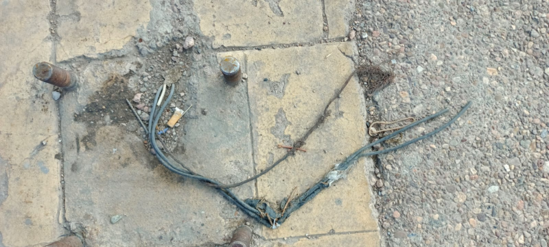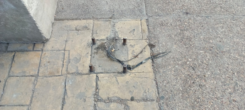 Los cables, que anteriormente formaban parte de una estructura de iluminación, están marcados con tornillos en el suelo, lo que representa un peligro significativo para los transeúntes. La situación es especialmente preocupante dado el clima lluvioso de los últimos días, que ha dejado las calles y plazas de la ciudad en condiciones de humedad constante.